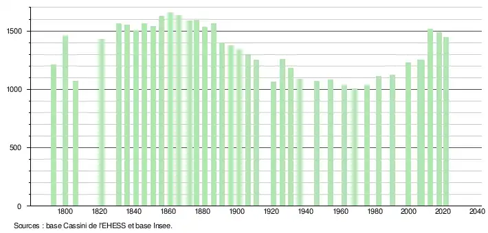 L'évolution du nombre d'habitants est connue à travers les recensements de la population effectués dans la commune depuis 1793. Pour les communes de moins de 10 000 habitants, une enquête de recensement portant sur toute la population est réalisée tous les cinq ans, les populations légales des années intermédiaires étant quant à elles estimées par interpolation ou extrapolation[20]. Pour la commune, le premier recensement exhaustif entrant dans le cadre du nouveau dispositif a été réalisé en 2007[21].