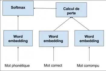 Ce problème est réglé par l'ajout d'un deuxième plongement lexical qui ne travaille pas sur la sémantique mais sur les mots proches phonétiquement. Ce dernier se base sur les ensembles de lettres. Par exemple, le mot "hello" est décomposé comme suit : {h, e, l, o, [h, he, el, lo, o], [he, hel, ell, llo, lo], . . . }. Afin de l’entraîner, deux plongements lexicaux phonétiques et un acoustique sont utilisés (voir figure ci-contre). Le flux de parole correspondant à un mot est envoyé en entrée du plongement lexical acoustique, puis deux mots pouvant correspondre (le bon mot ainsi qu'un mauvais) sont envoyés aux deux autres. Un tel entraînement permet de comprendre d'autres mots et permet d'apprendre les mots proches phonétiquement car leurs vecteurs ainsi calculés sont très proches.