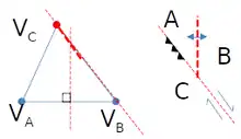 Par conséquent, par rapport au triangle , le point représentatif de la vitesse devra se situer sur une droite passant par , et de même direction que la frontière (AB), quelle qu'elle soit. Noter que dans ce cas, la position de A et B est inversée entre le schéma géologique et le schéma des vitesses.