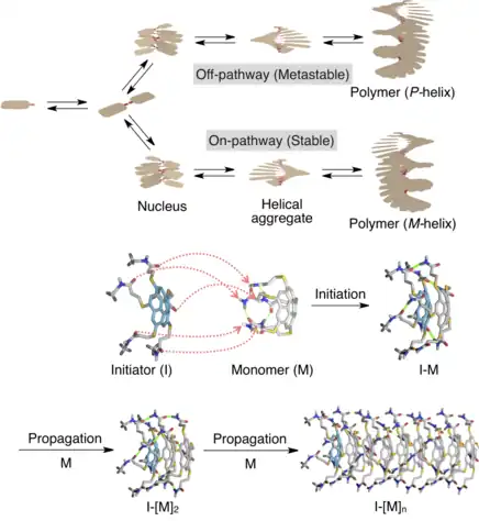 La polymérisation conventionnelle en chaîne comprend au moins deux phases; l'initiation et la propagation, tandis que, dans certains cas, des phases de terminaison et de transfert de chaîne se produisent également. La polymérisation supramoléculaire en chaîne au sens large implique deux phases distinctes; une nucléation moins favorisée et une propagation favorisée. Dans ce mécanisme, après la formation d'un noyau d'une certaine taille, la constante d'association est augmentée, une addition supplémentaire de monomère devient plus favorable, et la croissance du polymère est initiée. De longues chaînes de polymère ne se formeront qu'au-dessus d'une concentration minimale de monomère et en dessous d'une certaine température. Cependant, pour réaliser un analogue covalent de polymérisation supramoléculaire en chaîne, une condition préalable difficile est la conception de monomères appropriés qui ne peuvent polymériser que par l'action d'initiateurs. Récemment, un exemple de polymérisation supramoléculaire en avec des caractéristiques « vivantes » a été démontré[19]. Dans ce cas, un monomère en forme de bol avec des chaînes latérales attachées à un amide forme un réseau de liaison hydrogène intramoléculaire cinétiquement favorisé et ne subit pas spontanément une polymérisation supramoléculaire à température ambiante[20]. Cependant, une version N-méthylée du monomère sert d'initiateur en ouvrant le réseau de liaison hydrogène intramoléculaire pour la polymérisation supramoléculaire, tout comme la polymérisation covalente par ouverture de cycle. L'extrémité de la chaîne dans ce cas reste active pour une extension supplémentaire du polymère supramoléculaire et, par conséquent, le mécanisme en chaîne permet le contrôle précis des matériaux polymères supramoléculaires.