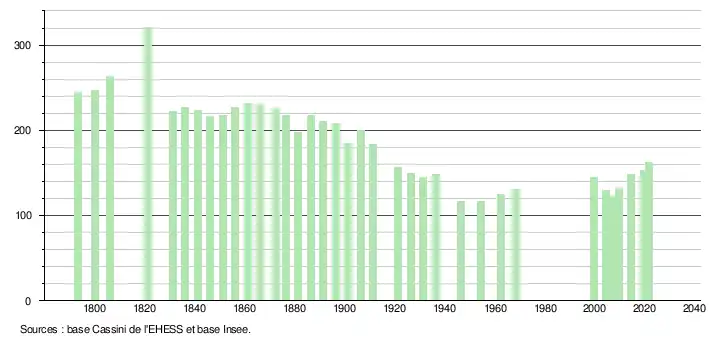 L'évolution du nombre d'habitants est connue à travers les recensements de la population effectués dans la commune depuis 1793. Pour les communes de moins de 10 000 habitants, une enquête de recensement portant sur toute la population est réalisée tous les cinq ans, les populations légales des années intermédiaires étant quant à elles estimées par interpolation ou extrapolation[19]. Pour la commune, le premier recensement exhaustif entrant dans le cadre du nouveau dispositif a été réalisé en 2004[20].