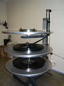 Il faut au minimum deux plateaux pour diffuser un film. Avec trois plateaux, on peut diffuser deux films en alternance dans la même cabine. Dans la photographie ci-contre, le film se déroule du plateau du milieu et s'enroule sur le plateau du haut ; le plateau du bas contient un film en attente de projection.