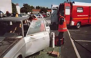 Découpe de voiture lors d'un exercice de secours routier