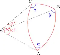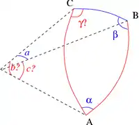 On considère un triangle dont l'angle γ est connu, ainsi que les deux côtés adjacents a et b. Le dernier côté s'obtient grâce au théorème d'Al-Kashi, les deux angles manquants par la loi des tangentes et le complément à π, et l'aire par la formule du produit vectoriel :