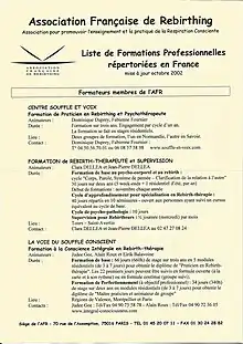La technique fut importée en France dans les années 1970 par plusieurs psychothérapeutes, entre autres Jacques de Panafieu[5] et la psychologue Dominique Levadoux[6]. S'y intégrèrent alors des éléments d'autres pratiques thérapeutiques comme la psychanalyse et la gestalt-thérapie et elle adopta le nom de Rebirth ou Rebirth-thérapie.
