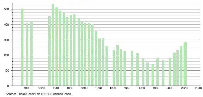 L'évolution du nombre d'habitants est connue à travers les recensements de la population effectués dans la commune depuis 1793. Pour les communes de moins de 10 000 habitants, une enquête de recensement portant sur toute la population est réalisée tous les cinq ans, les populations légales des années intermédiaires étant quant à elles estimées par interpolation ou extrapolation[20]. Pour la commune, le premier recensement exhaustif entrant dans le cadre du nouveau dispositif a été réalisé en 2005[21].