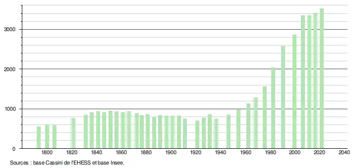 L'évolution du nombre d'habitants est connue à travers les recensements de la population effectués dans la commune depuis 1793. Pour les communes de moins de 10 000 habitants, une enquête de recensement portant sur toute la population est réalisée tous les cinq ans, les populations légales des années intermédiaires étant quant à elles estimées par interpolation ou extrapolation[23]. Pour la commune, le premier recensement exhaustif entrant dans le cadre du nouveau dispositif a été réalisé en 2006[24].