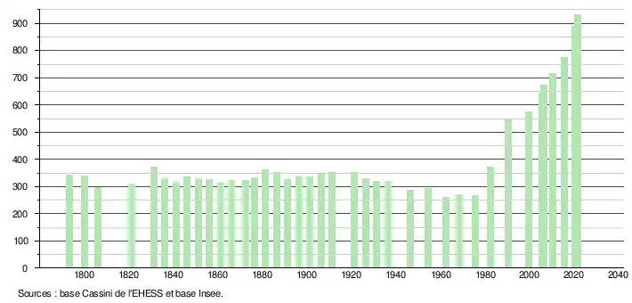 L'évolution du nombre d'habitants est connue à travers les recensements de la population effectués dans la commune depuis 1793. Pour les communes de moins de 10 000 habitants, une enquête de recensement portant sur toute la population est réalisée tous les cinq ans, les populations légales des années intermédiaires étant quant à elles estimées par interpolation ou extrapolation[19]. Pour la commune, le premier recensement exhaustif entrant dans le cadre du nouveau dispositif a été réalisé en 2005[20].