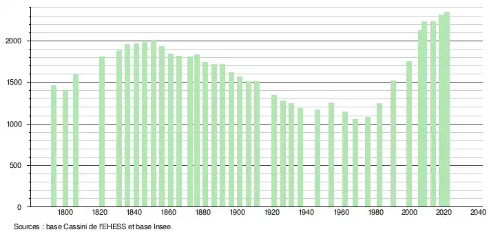 L'évolution du nombre d'habitants est connue à travers les recensements de la population effectués dans la commune depuis 1793. Pour les communes de moins de 10 000 habitants, une enquête de recensement portant sur toute la population est réalisée tous les cinq ans, les populations légales des années intermédiaires étant quant à elles estimées par interpolation ou extrapolation[33]. Pour la commune, le premier recensement exhaustif entrant dans le cadre du nouveau dispositif a été réalisé en 2008[34].