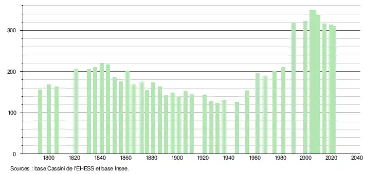 L'évolution du nombre d'habitants est connue à travers les recensements de la population effectués dans la commune depuis 1793. Pour les communes de moins de 10 000 habitants, une enquête de recensement portant sur toute la population est réalisée tous les cinq ans, les populations légales des années intermédiaires étant quant à elles estimées par interpolation ou extrapolation[24]. Pour la commune, le premier recensement exhaustif entrant dans le cadre du nouveau dispositif a été réalisé en 2004[25].