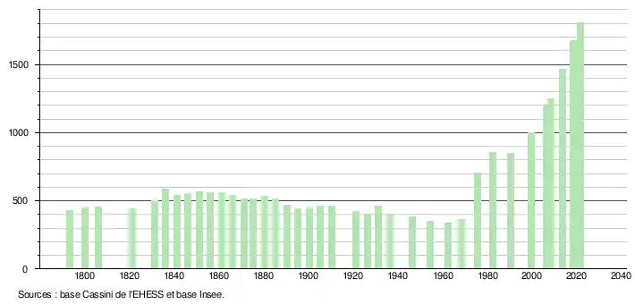 L'évolution du nombre d'habitants est connue à travers les recensements de la population effectués dans la commune depuis 1793. Pour les communes de moins de 10 000 habitants, une enquête de recensement portant sur toute la population est réalisée tous les cinq ans, les populations légales des années intermédiaires étant quant à elles estimées par interpolation ou extrapolation[17]. Pour la commune, le premier recensement exhaustif entrant dans le cadre du nouveau dispositif a été réalisé en 2008[18].