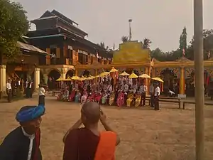 Au monastère, les moines sont réunis pour présider la cérémonie et recevoir leur jeune protégé ainsi que diverses aumônes et offrandes. Un festin a été préparé pour tous, avec des tables rondes basses posées sur de fines nattes et tapis de bambou ou dans un chapiteau avec de longues tables et bancs de bambou. Cette journée aura été déclarée "journée sans fumée" (မီးခိုးတိတ် migo deik) pour le village car aucun feu de cuisson ne sera allumé et tout le monde, y compris les chiens, sera le bienvenu au festin qui comprendra des plats de viande et de volaille, une soupe ou un bouillon, du poisson salé au curry avec des légumes à part, des mangues vertes fermentées ou des germes de haricots suivis d'un dessert, toujours avec du lahpet.