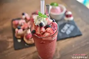 Smoothie aux fruits rouges surmonté de myrtilles et de morceaux d'ananas. | |