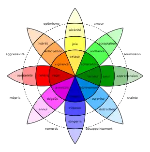 Parmi les différentes catégorisations des affects proposées[78] la distinction la plus fréquente est celle des émotions et des humeurs. Ces deux types d’affects se différencient à la fois par leur intensité (les émotions sont plus intenses que les humeurs) et par leur direction (les émotions sont liées à un objet particulier contrairement aux humeurs). On peut ajouter aussi une distinction sur l’expression physique de ces affects, les émotions pouvant être caractérisées par des mimiques faciales (notamment la joie, la surprise, la colère, la peur, la tristesse et le dégoût) ou par des réactions physiologiques[79],[80] contrairement aux humeurs. La haine, la honte, la jalousie, l’envie, l’amour, la terreur ou encore la culpabilité seront donc plutôt catégorisées comme des émotions, alors que la confiance, la nostalgie, l’indifférence, la fatigue, l’optimisme, l’état pensif, relaxé, grognon ou encore tendu seront plutôt catégorisés comme des humeurs[81]. Émotions et humeurs sont aussi caractérisées par leur valence, c'est-à-dire leur dimension positive ou négative (plaisante ou déplaisante). Les deux polarités (positive et négative) de l’affect interviennent la plupart du temps de manière indépendante, notamment lors des épisodes émotionnels intenses[82]. Enfin, les émotions et les humeurs se distinguent par leur fréquence et leur durée (les émotions étant en général plus courtes et moins fréquentes). Plusieurs taxonomies des émotions ont été proposées. Elles sont généralement issues de la psychologie évolutionniste, s'inspirent des premiers travaux de Charles Darwin[83] et distinguent les émotions de base des émotions secondaires qui sont perçues comme des combinaisons de plusieurs émotions de base. Les émotions de base les plus souvent citées sont la joie, la tristesse, la colère, le dégoût et la peur, auxquelles s'ajoute parfois la surprise. Les émotions de base sont généralement associées à des expressions faciales qui sont transculturelles et se retrouvent même chez certains animaux.