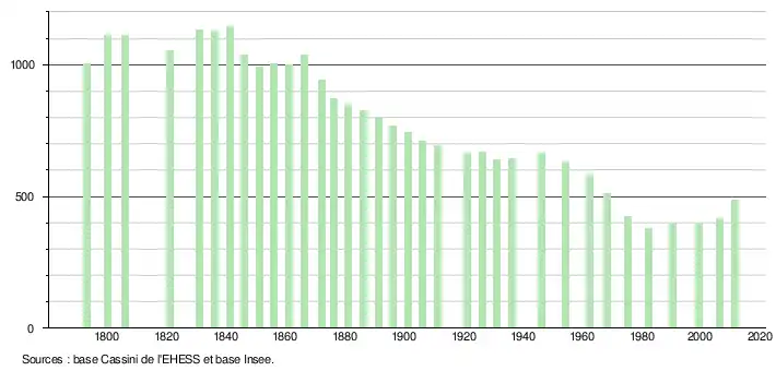 - Dans le tableau des recensements et le graphique, par convention dans Wikipédia, le principe a été retenu, pour les populations légales postérieures à 1999 de n’afficher dans le tableau des recensements et le graphique que les populations correspondant à l'année 2006, première population légale publiée calculée conformément aux concepts définis dans le décret no 2003-485 du 5 juin 2003, et les années correspondant à une enquête exhaustive de recensement pour les communes de moins de 10 000 habitants, ainsi que la dernière population légale publiée par l’Insee.
