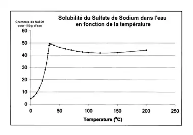 Cette caractéristique de la solubilité du sulfate de sodium peut être expliquée par le fait que la valeur de 32,4 °C correspond à la température à laquelle le composé décahydratée du sulfate de sodium (sel de Glauber ou mirabilite naturelle) se décompose pour former une phase solide anhydre (thénardite) et un excédent d'eau liquide.