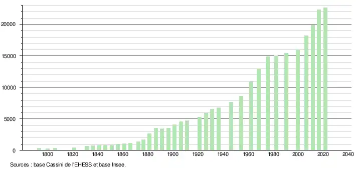 - Par convention dans Wikipédia, le principe a été retenu de n’afficher dans le tableau des recensements et le graphique, pour les populations légales postérieures à 1999, que les populations correspondant à une enquête exhaustive de recensement pour les communes de moins de 10 000 habitants, et que les populations des années 2006, 2011, 2016, etc. pour les communes de plus de 10 000 habitants, ainsi que la dernière population légale publiée par l’Insee pour l'ensemble des communes.