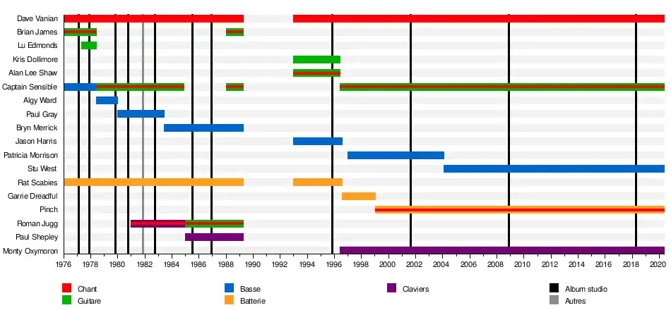 - Captain Sensible − basse (1976–1978), guitare (1978–1984, 1989, 1991, depuis 1996)