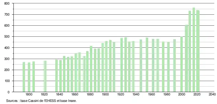 L'évolution du nombre d'habitants est connue à travers les recensements de la population effectués dans la commune depuis 1793. Pour les communes de moins de 10 000 habitants, une enquête de recensement portant sur toute la population est réalisée tous les cinq ans, les populations légales des années intermédiaires étant quant à elles estimées par interpolation ou extrapolation[15]. Pour la commune, le premier recensement exhaustif entrant dans le cadre du nouveau dispositif a été réalisé en 2005[16].