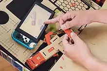 Une personne utilisant le kit robot pour interagir avec le jeu sur la console Nintendo Switch.