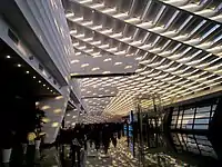 Chaque niveau a été dessiné par un architecte différent avec, de ce fait, des couleurs, formes et matériaux distincts mais le tout restant transparent et fluide et se liant parfaitement avec les colonnes formées de lignes entrelacées.
