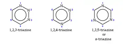 La structure de la triazine est hétérocycle aromatique, analogue au cycle à six atome du benzène, mais avec trois atomes de carbone remplacés par des atomes d'azote. Les trois isomères correspondent donc aux emplacements respectifs des atomes de carbone et d'azote sur le cycle. On compte ainsi la 1,2,3-Triazine, la 1,2,4-Triazine, et la 1,3,5-Triazine. Les autres hétérocycles aromatiques courant contenant de l'azote sont les azines (en particulier la pyridine) qui contiennent un atome d'azote, les diazines qui contiennent deux et les tétrazines qui en contiennent quatre.