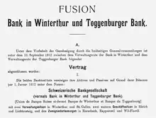 L'Union de banques suisses, en allemand : Schweizerische Bankgesellschaft, créée par une fusion en 1912, avait ses racines avec la Bank in Winterthur (fondé en 1862, spécialisée dans le financement industriel) et la Toggenburger Bank (fondée en 1863, caisse d'épargne)[24]. La banque de Winterthour fondée en 1862 avec un capital initial de 5 millions de francs suisses, s’est concentrée sur le financement des industries et autres compagnies[25], et a fortement profité de ses connexions ferroviaires et de grands entrepôts pendant la guerre civile américaine, alors que le prix du coton avait augmenté fortement[26]. Initialement, le nom en anglais était traduit par Swiss Banking Association, mais il a été changé en Union Bank of Switzerland pour obtenir la même abréviation qu'en français : UBS. La banque dans son ensemble représentait une fortune totale de 202 millions de francs suisses et un total de part d’actionnaire de 46 millions de francs. En 1917, UBS a terminé la construction de son nouveau siège social et elle a emménagé dans le nouveau siège principal dans la Bahnhofstrasse à Zurich, considérée comme étant le Wall Street de la Suisse. En 1923, des filiales étaient établies dans toute la Suisse.