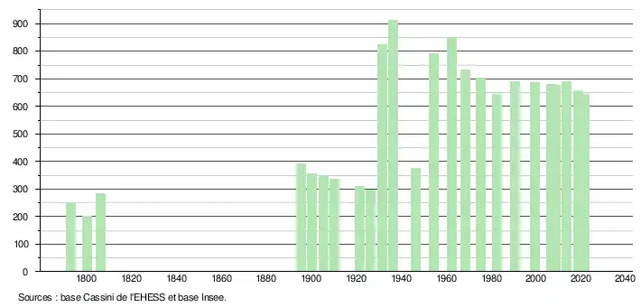 L'évolution du nombre d'habitants est connue à travers les recensements de la population effectués dans la commune depuis 1793. Pour les communes de moins de 10 000 habitants, une enquête de recensement portant sur toute la population est réalisée tous les cinq ans, les populations légales des années intermédiaires étant quant à elles estimées par interpolation ou extrapolation[20]. Pour la commune, le premier recensement exhaustif entrant dans le cadre du nouveau dispositif a été réalisé en 2008[21].