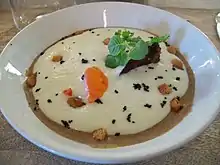 - velouté froid de petits pois et de crème de raifort (Anne-Sophie Pic)[30] ;