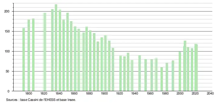 L'évolution du nombre d'habitants est connue à travers les recensements de la population effectués dans la commune depuis 1793. Pour les communes de moins de 10 000 habitants, une enquête de recensement portant sur toute la population est réalisée tous les cinq ans, les populations légales des années intermédiaires étant quant à elles estimées par interpolation ou extrapolation[17]. Pour la commune, le premier recensement exhaustif entrant dans le cadre du nouveau dispositif a été réalisé en 2005[18].