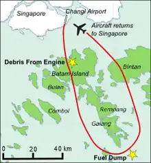 L'accident s'est produit le à 10 h 1 heure locale (2 h 1 UTC) alors que l'appareil redécollait de Singapour en direction de Sydney. Quatre minutes après le décollage, en pleine phase de montée au-dessus de l'île indonésienne de Batam, l'explosion non contenue du disque de la turbine à pression intermédiaire du réacteur no 2 a provoqué de nombreux dégâts sur l’aile gauche[4]. La projection de débris et de morceaux de disque a détruit le carénage du réacteur, perforé l'aile et endommagé le système d’approvisionnement en kérosène. Les débris ont également désactivé un des systèmes hydrauliques et les freins anti-blocage, mis les réacteurs no 1 et no 4 en mode dégradé, endommagé le fonctionnement des dispositifs hypersustentateurs de l'aile gauche et le système de contrôle du réacteur no 1[5].