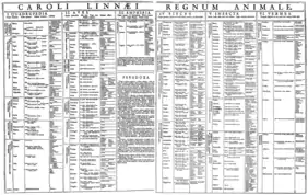 Carl von Linné (1707-1778) est un naturaliste suédois qui a jeté les bases du système moderne de la nomenclature binomiale. Connu comme le père de la taxonomie moderne, c'est à ce titre qu'il est important pour la zoologie, même s'il était surtout botaniste. Dans la dixième édition (1758) du Systema Naturae, Linné recensait environ 4 400 espèces animales différentes, dont près du tiers, soit 1335 espèces, étaient des Vertébrés[21].