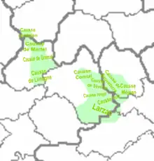 - (Géographie) Un des plateaux karstiques fortement érodés caractéristiques des auréoles sédimentaires du sud et de l'ouest du Massif central en France.