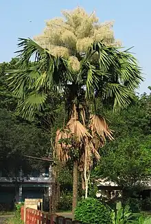 - (1753) Du grec ancien κορυφή, koryphḗ (« tête ») car la floraison au sommet de l’arbre ressemble à une gigantesque tête