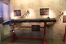 Le ché, autre instrument à cordes stables et pincées, a une forme analogue à celle du kin, ainsi qu’on le voit ici (1) : Fig. 16. Les dimensions du ché et le nombre de ses cordes paraissent avoir varié : les auteurs chinois, cités par Amiot, lui donnent une longueur de 7 pieds 2 pouces chinois, ou 1m,835, et une largeur de 1 pied 8 pouces, ou 0m,457. D’autres ché ont des dimensions plus petites.