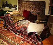 — (Honoré de Balzac, Béatrix, 1838-1844, première partie)Placé dans la salle, le long du mur et recouvert de tapis d'Orient ou canins (du Caire), le coffre fait l'office d'un divan.