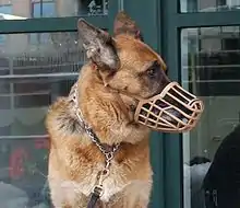 - Allemand : Maulkorb (de) masculin, Beißkorb (de) masculin