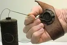 - (Art) Morceau de cuir dont l’ouvrier garnit sa main.